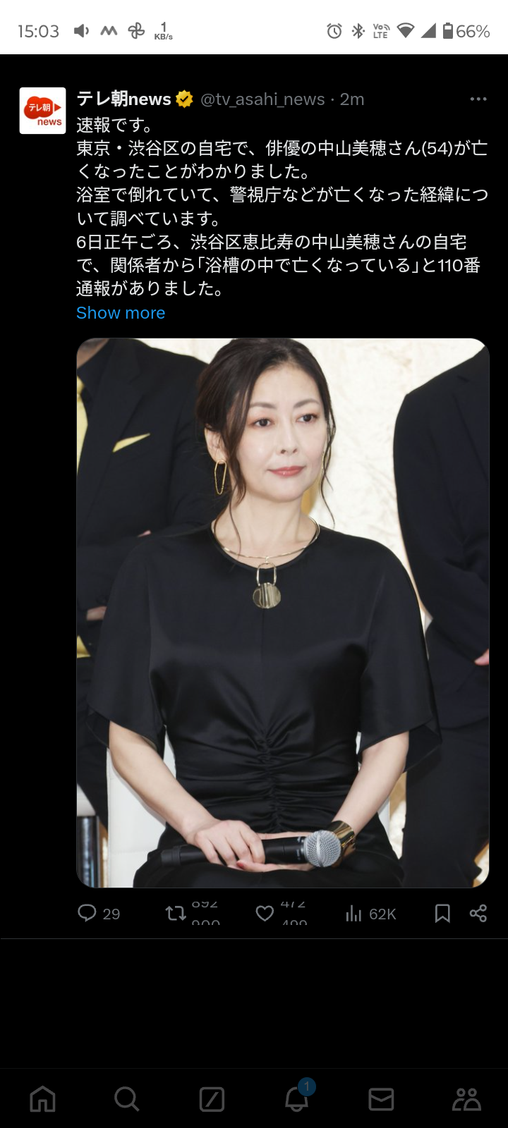 【速報】俳優の中山美穂さん(54)が東京・渋谷区の自宅で死亡しているのが見つかる(テレビ朝日系(ANN)) - Yahoo!ニュース