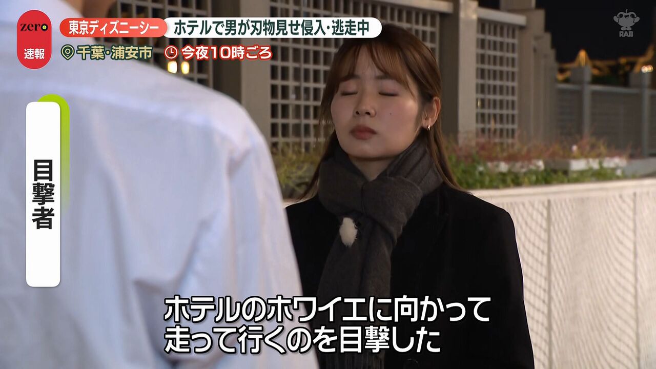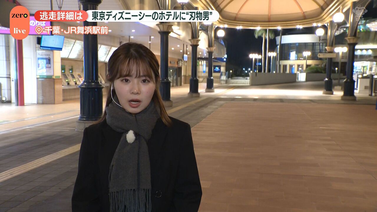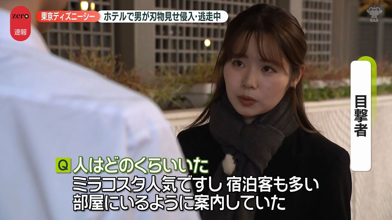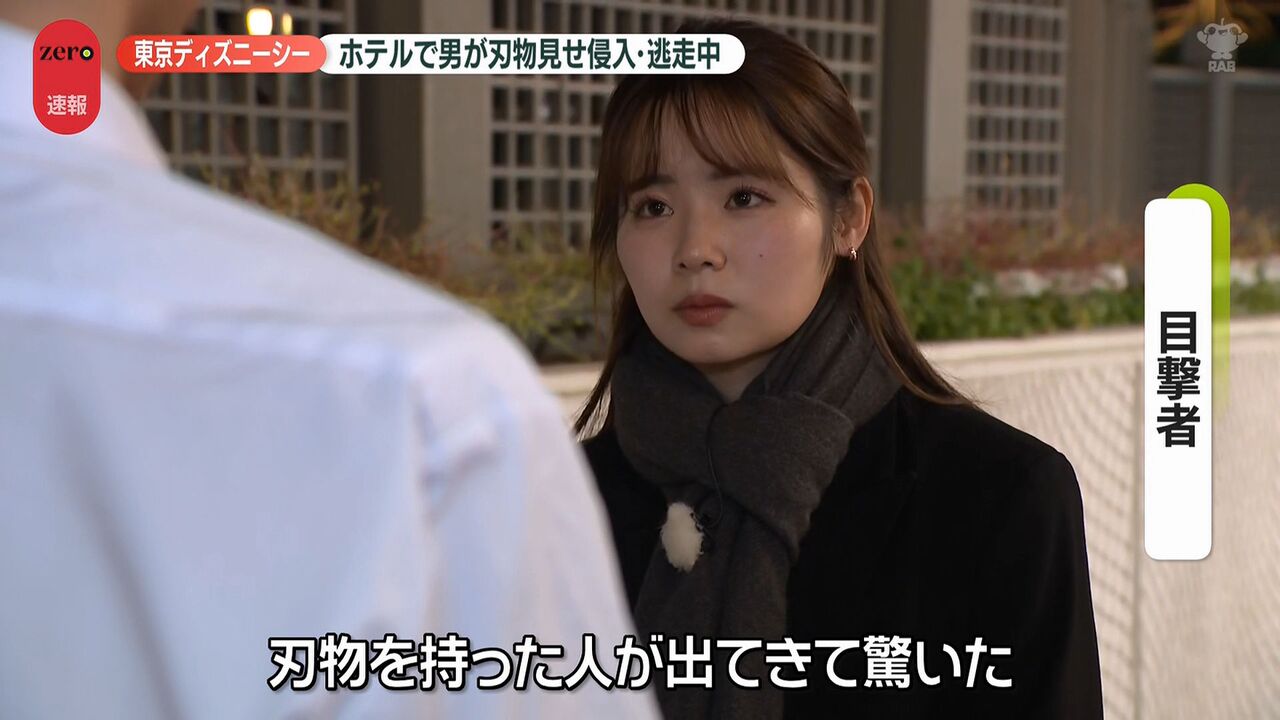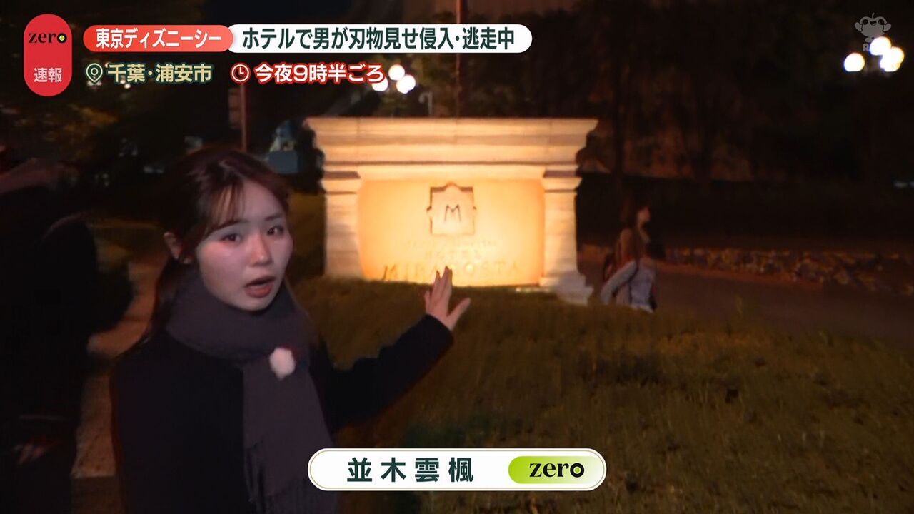 | “刃物男”がホテルミラコスタに侵入、逃走中 目撃した男性は… 東京ディズニーシー …ながら通っていった。動揺して足がすくんだ」 ■舞浜駅には警察官集まる並木雲楓フィールドキャスター(news zero) 「東京ディズニーシーのホテル… (出典:日テレNEWS NNN) |