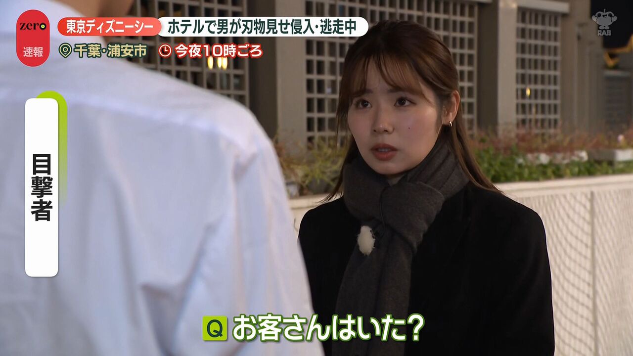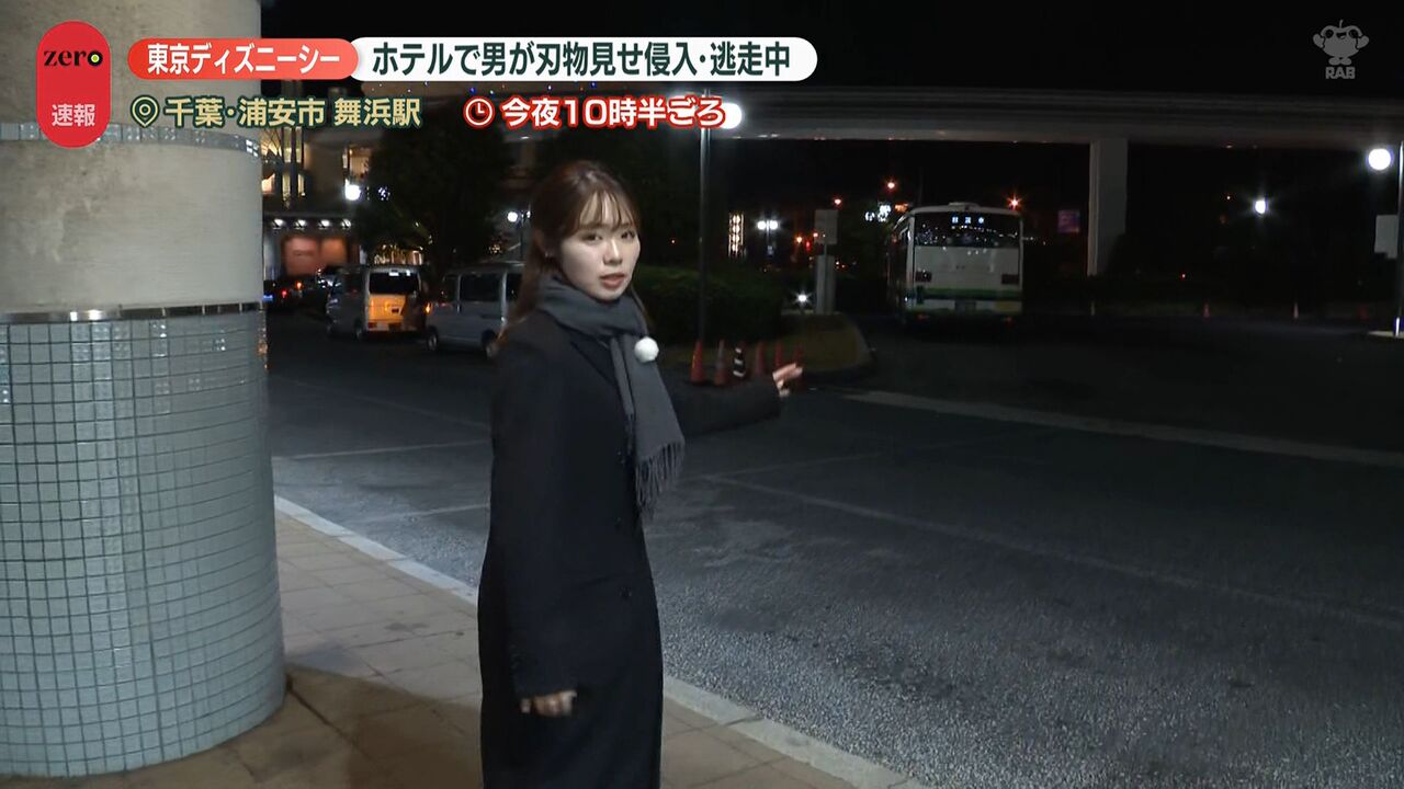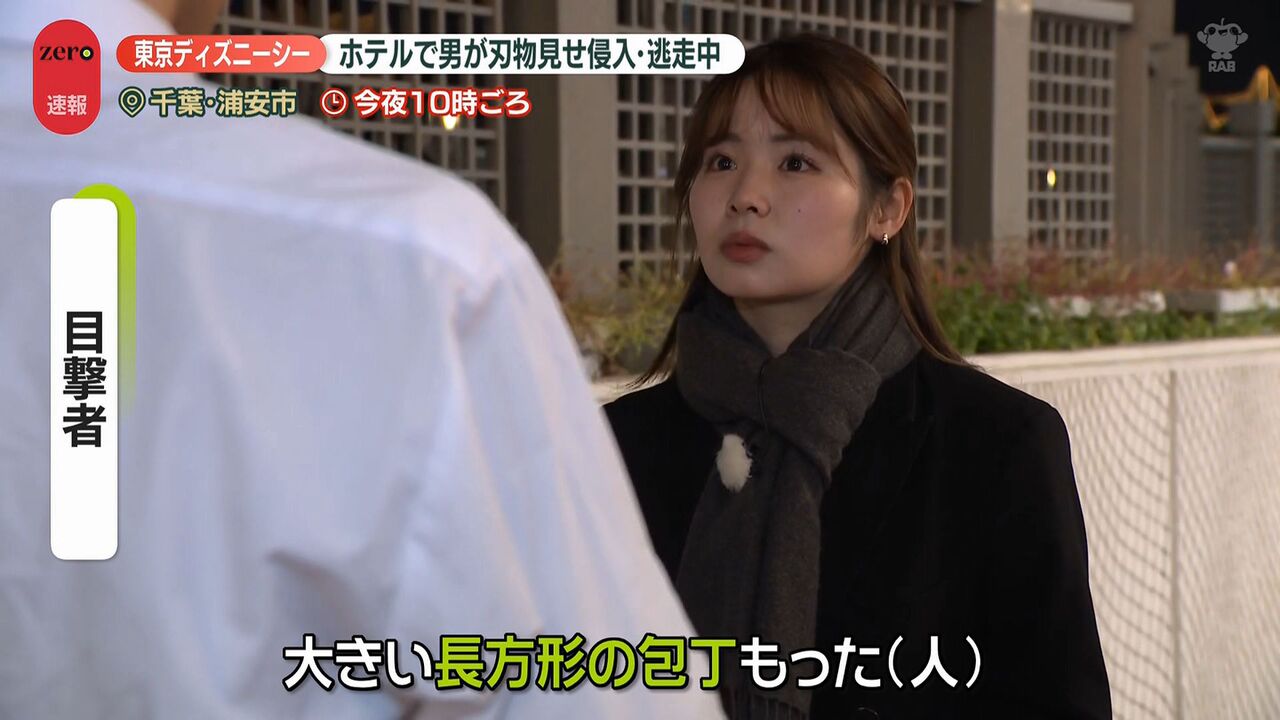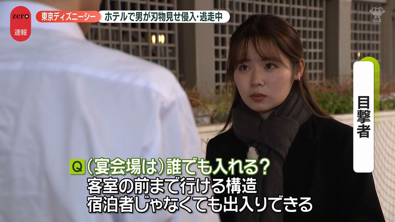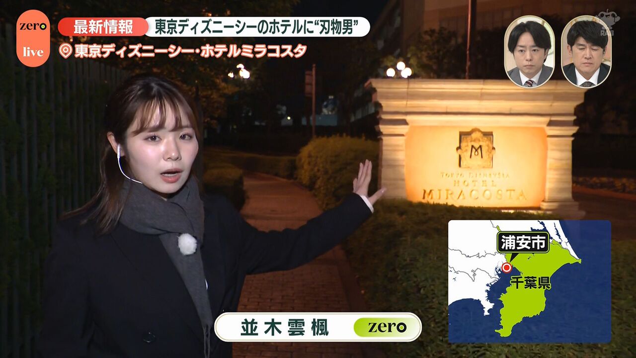 | “刃物男”がホテルミラコスタに侵入、逃走中 目撃した男性は… 東京ディズニーシー …ながら通っていった。動揺して足がすくんだ」 ■舞浜駅には警察官集まる並木雲楓フィールドキャスター(news zero) 「東京ディズニーシーのホテル… (出典:日テレNEWS NNN) |