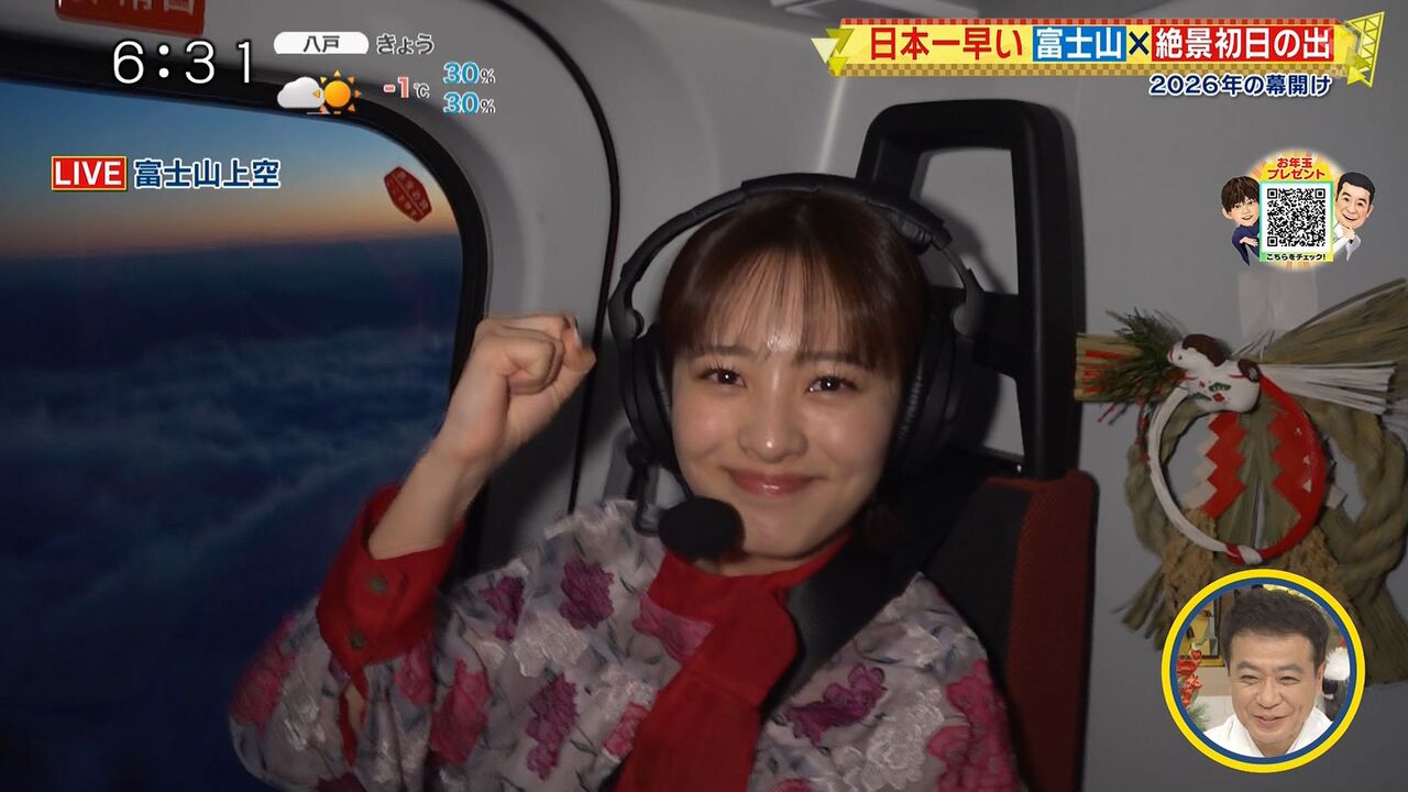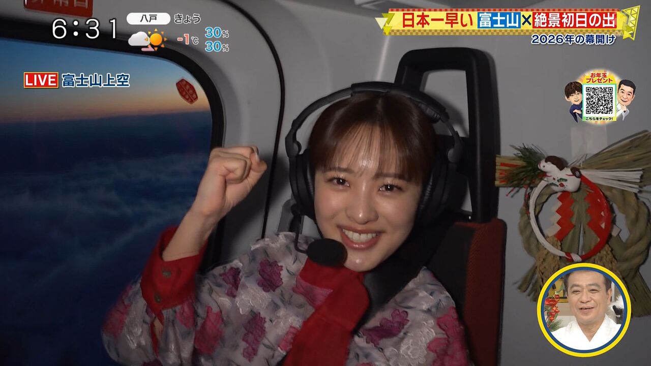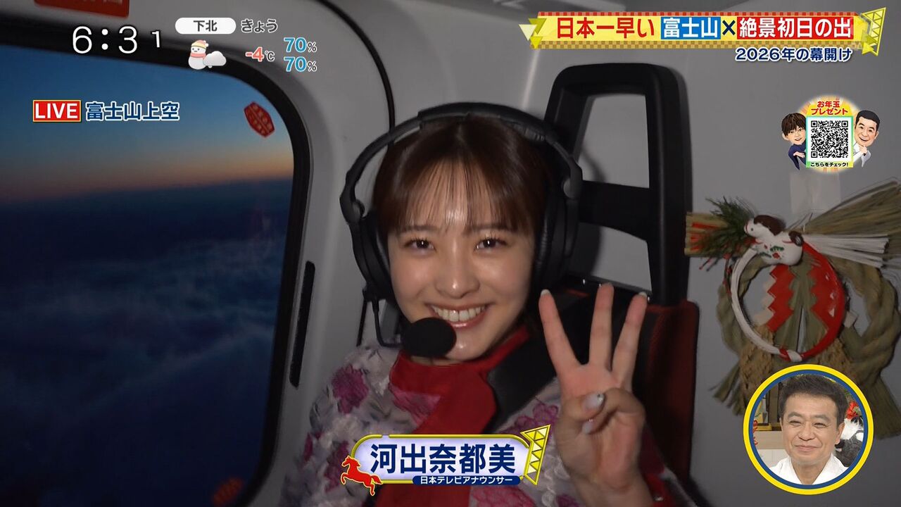 河出奈都美アナウンサーが初日の出中継をヘリから生中継し、2025年から2026年への新春を彩る。